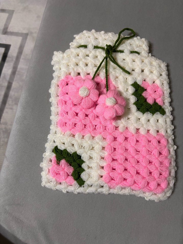 Renkli ve pembe çiçek desenli, yaprak detaylı örgü banyo süngeri, yumuşak dokusuyla banyo keyfi sunar.
