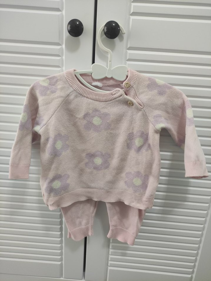 Pastel pembe renkli, örgü uzun kollu üstü çiçek desenli, altı uyumlu bebek takımı. Yumuşak ve rahat kumaşlı.
