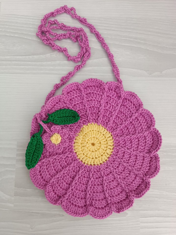 Pembe renkte, sarı merkezli ve yeşil yaprak detaylı çiçek desenli örgü bohem tarzda çanta.
