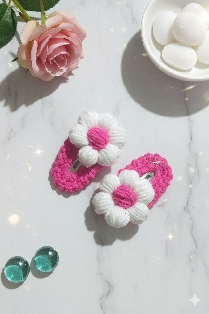 Renkli, pembe örgü çocuk tokaları, çiçek desenli ve bohem tarzda tasarlanmıştır. Yumuşak dokulu, şirin çiçek detaylıdır.