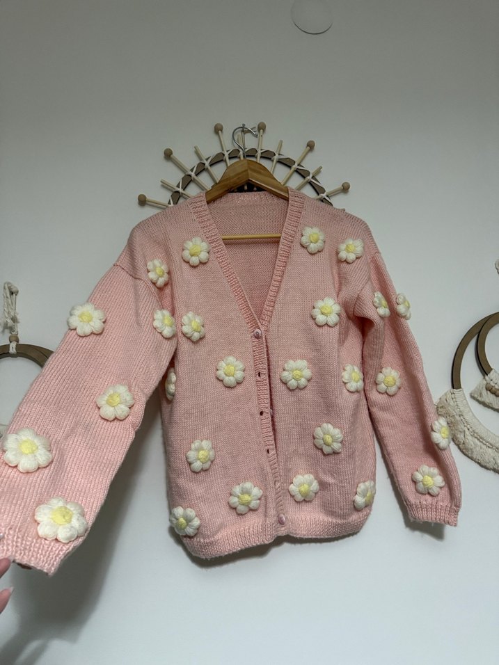 Pembe pastel renkte, uzun kollu, bol kesim örgü kız hırka, 3D çiçek desenleriyle bohem tarzı sunar.