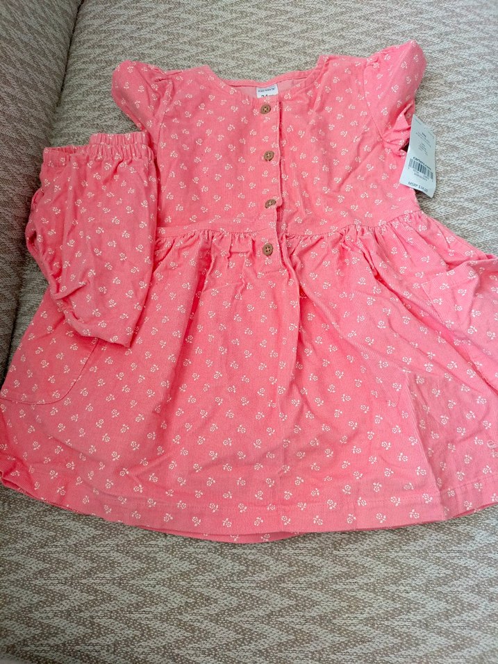 Etiketli Carter'a marka elbise düğmeli ön kısmı ve uzun kollu, pamuklu pembe çiçekli kız elbisesi. Rahat kalıp ve straplez yaka tasarımıyla.