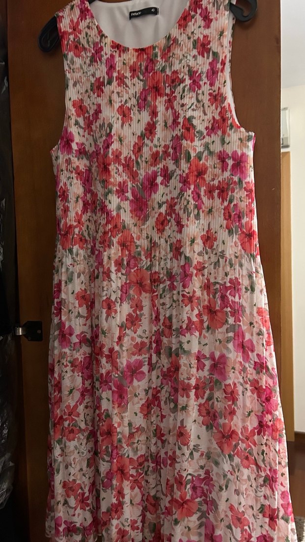 Kolsuz, diz boyda, bol kesim pilili elbise. Açık pembe çiçek desenli, kumaştan, bohem tarzında. Her ortamda giyilir.Yeni ve temiz.İade yoktur.