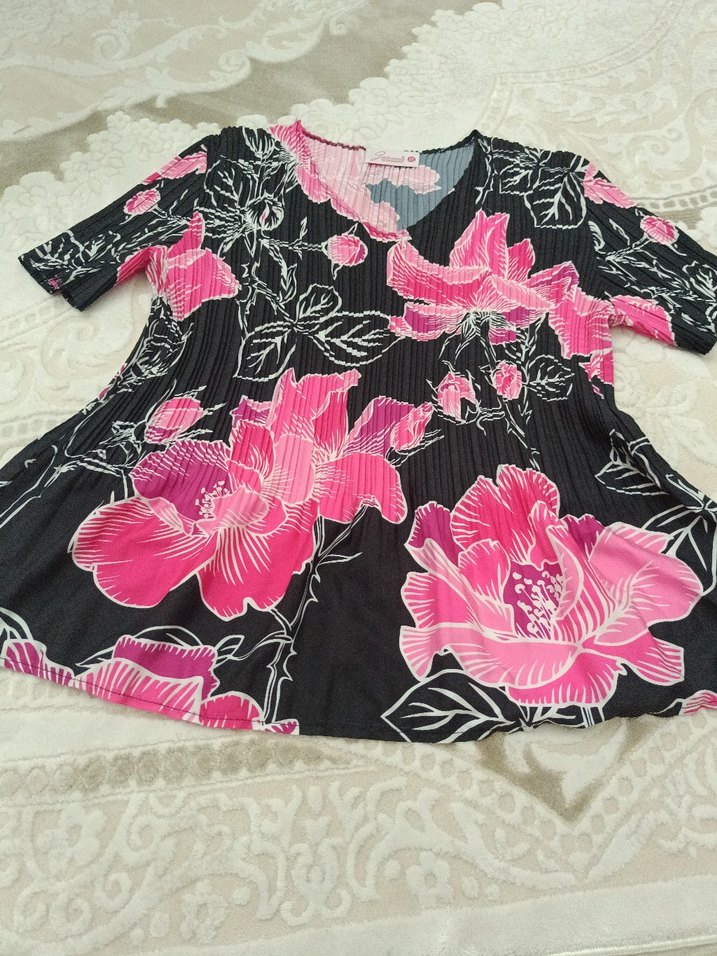 Pembe çiçek desenli, piliseli, kısa kollu, V yakalı, bol kesim tunik. Bohem tarz için uygun alınan üründe iade yoktur