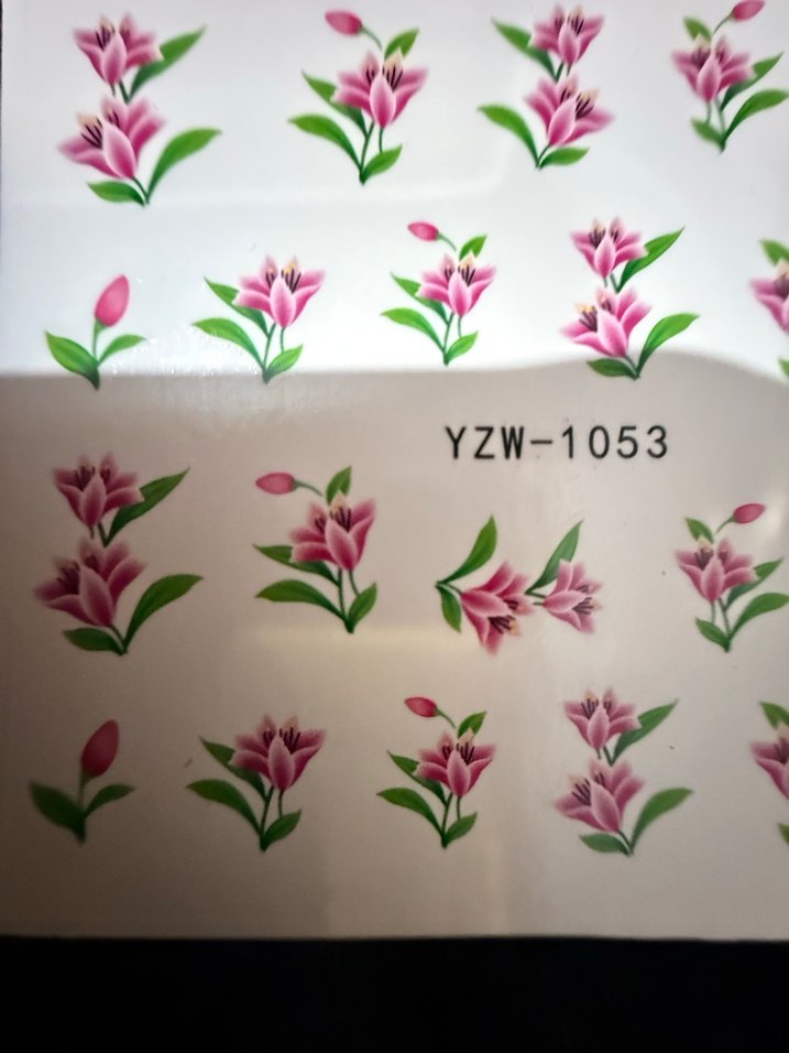 Pembe çiçek desenli, renkli tırnak süslemeleri YZW-1053 koduyla. Tırnaklara zarif bir görünüm katar.