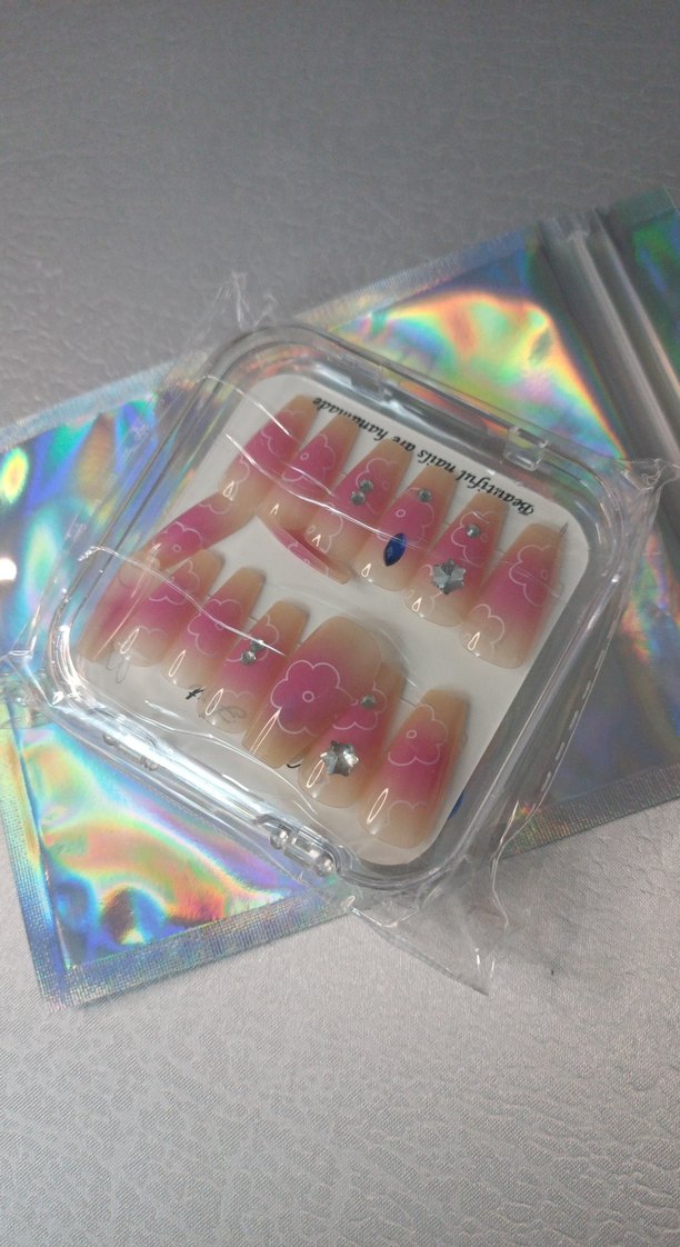 Pembe çiçek desenli ve küçük taşlı renkli tırnak süsleri, tırnaklara canlılık katar.