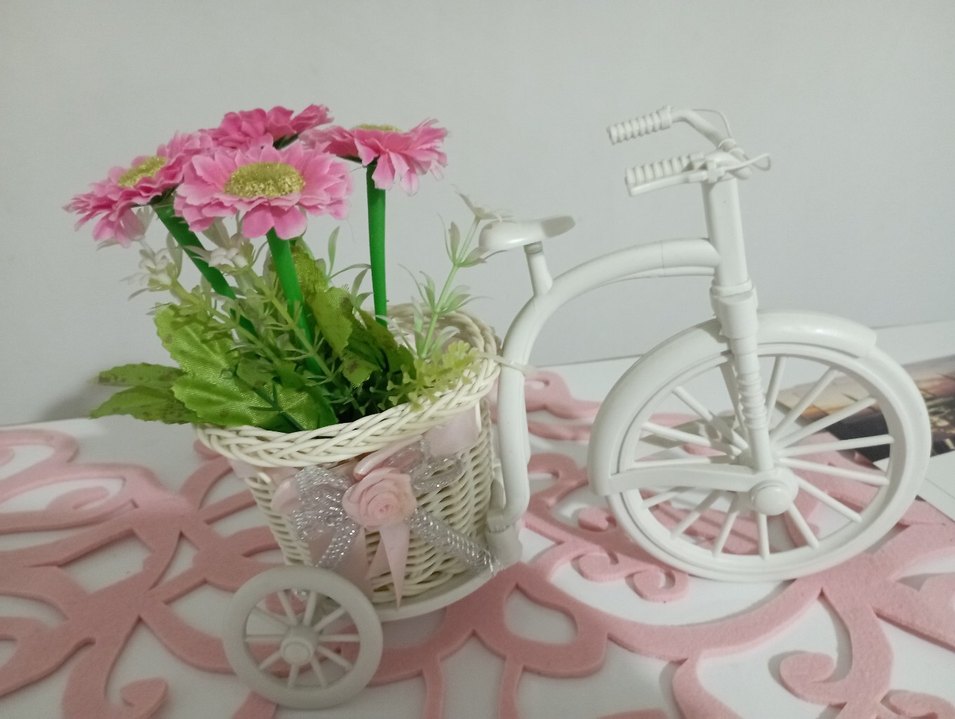 Sepetinde pembe yapay çiçekler ve yeşil yapraklar bulunan beyaz dekoratif bisiklet. Sepet, gümüş kurdele ve küçük pembe gül ile süslenmiştir. ikisinin fiyatıdir
