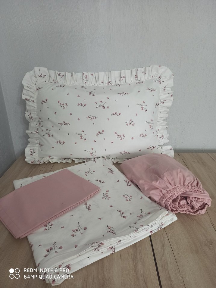 Pastel pembe çiçek desenli nevresim takımı, fırfırlı yastık kılıfı ve uyumlu çarşaf içerir, yumuşak kumaştan üretilmiştir.