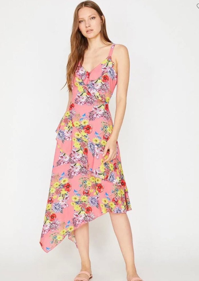 Pembe Çiçekli Uzun Askılı elbise koton