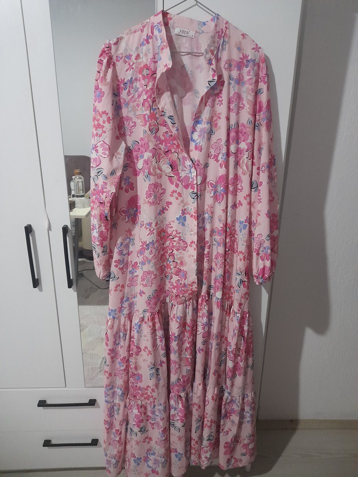 Pembe pastel tonlarda çiçek desenli, uzun kollu ve yakalı, düğmeli, bol kesim bohem elbise. Günlük kullanıma uygun yumuşak sentetik kumaştan.