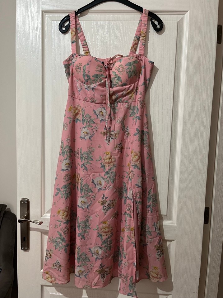 Pembe bohem elbise, askılı ve oturan üst kısmıyla uzun, drapeli etek içerir. Yumuşak sentetik kumaştan, pastel çiçekli batik deseniyle günlük kullanıma uygundur. Görselde göründüğü gibi herhangi bir sorunu yoktur hiç degilmedi