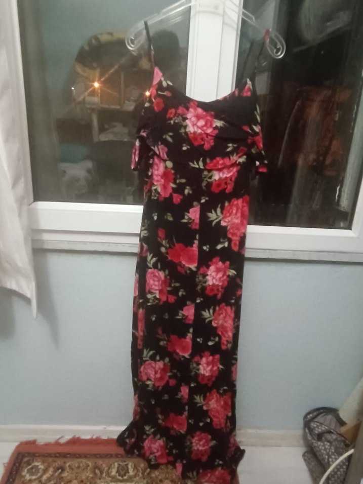 Uzun, bol kesim elbise, askılı ve straplez yakaya sahip. Yumuşak sentetik kumaştan, pembe koyu çiçek desenli ve drapeli. Romantik akşamlar için uygun.