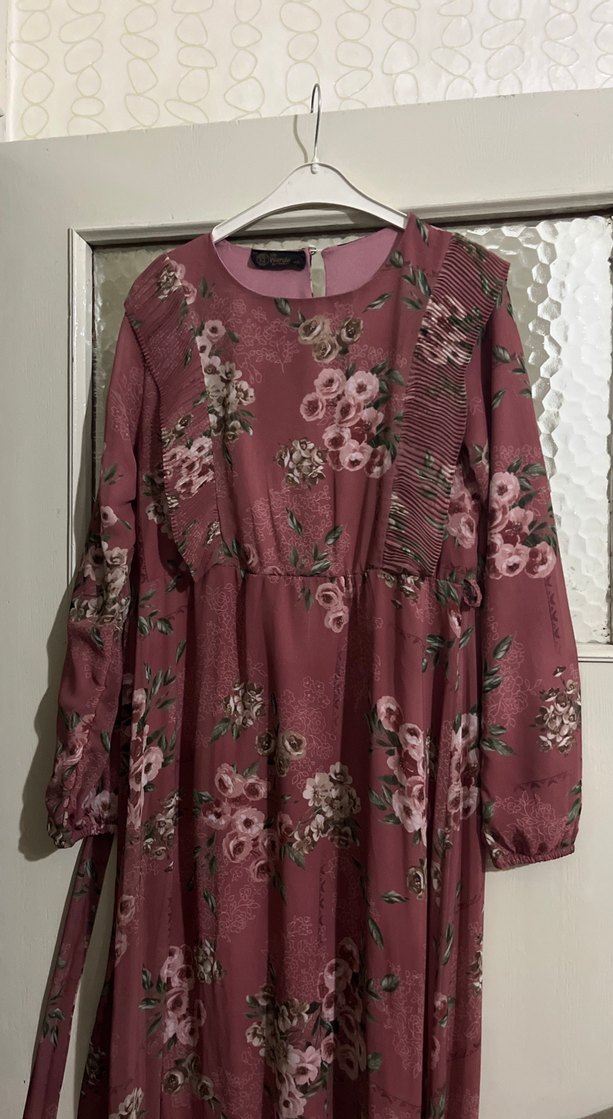 Uzun kollu, pembe çiçek desenli ve fırfırlı detaylara sahip, yumuşak sentetik kumaştan yapılmış bol kesim bohem elbisedir.