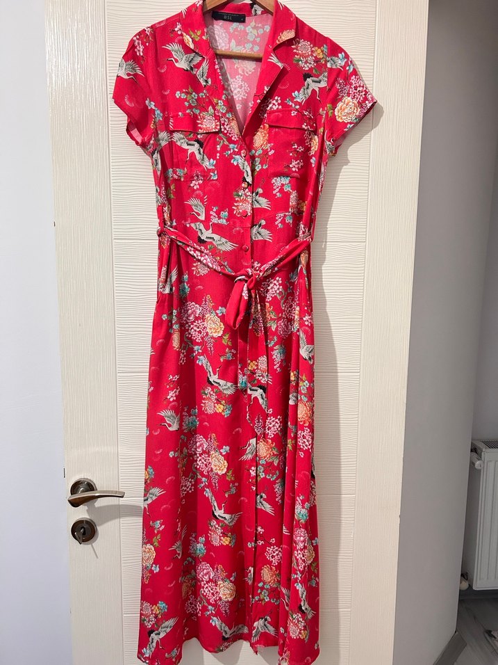 Pembe çiçek desenli, V yakalı ve kısa kollu uzun elbise. İpek gibi yumuşak kumaştan, bol kesim ve kemerli bohem tarzda, romantik akşamlar için uygun.