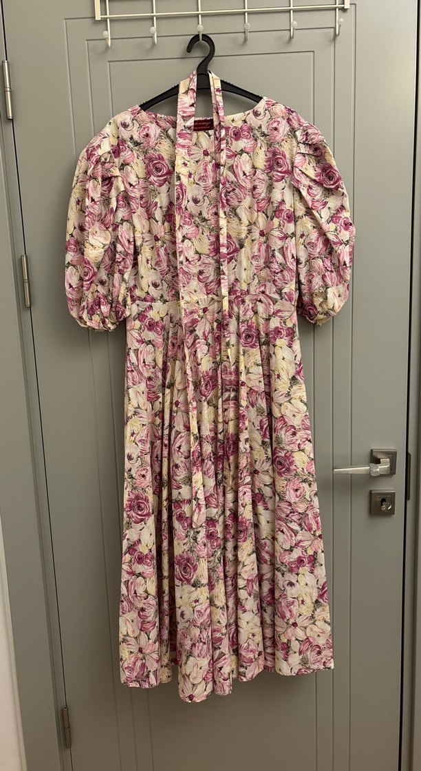 Pembe pastel çiçek desenli, bol kesim, uzun bohem elbise. Balon kollu ve halter yaka detaylarıyla vintage tarzı yansıtıyor.