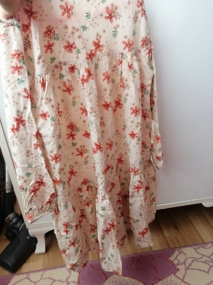 Uzun, bol kesim elbise, uzun kollu ve V yaka detaylıdır. Sentetik kumaştan üretilmiş, pastel pembe çiçekli baskıya ve fırfır detayına sahiptir, bohem tarzı yansıtır. 5 yaşa kadar uygundur kumaşı Pamuk yanında bir elbise hedıyemdır