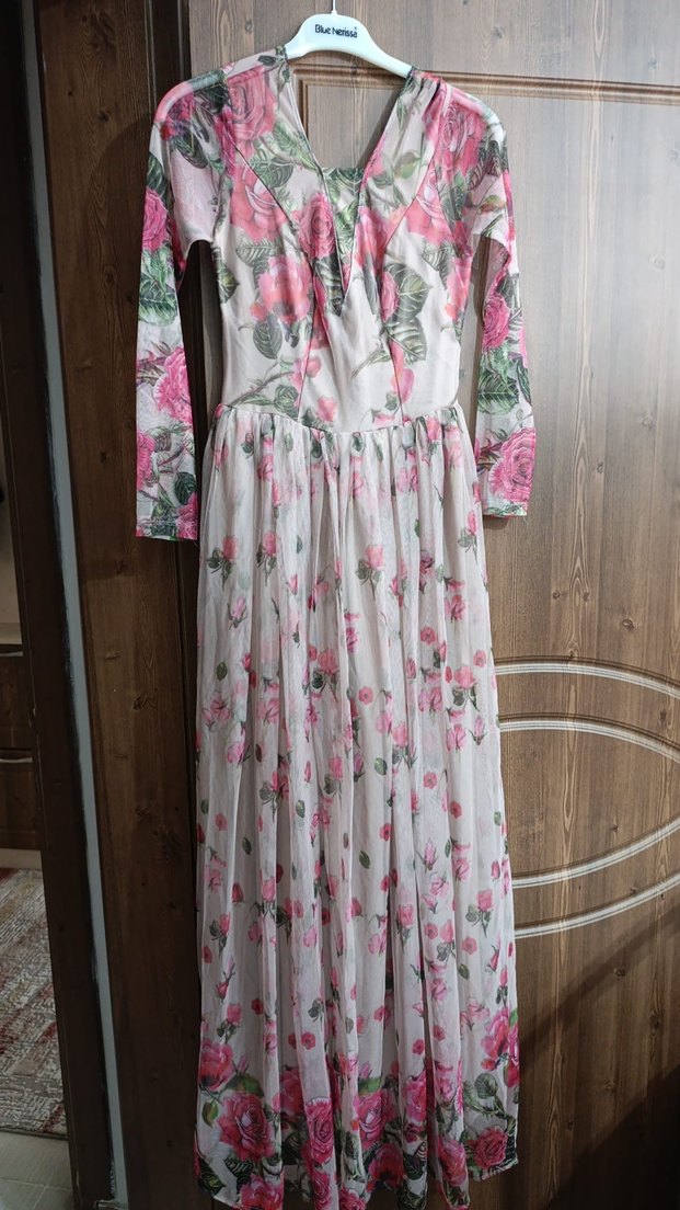 Pembe pastel renkte, uzun kollu, V yakalı, pileli ve bol kesim çiçek desenli sentetik kumaş elbise. Düğün için uygundur. Hem tesettür hem açık uyumlu