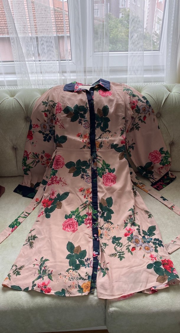 Pembe uzun kollu, bol kesim, yakalı ve düğmeli, çiçek desenli bohem tarzda sentetik kumaş elbise.