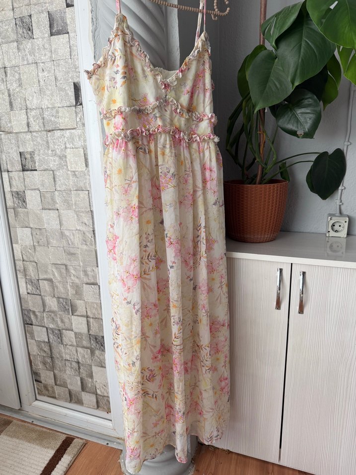 Pembe çiçek desenli uzun elbise, straplez yaka ve bol kesimle drapeli detaylar sunar. Yumuşak sentetik kumaştan, askılı kollu ve bohem tarzda, düğünler için uygun.