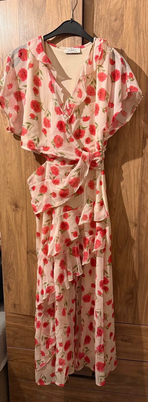 Pembe Çiçekli Uzun Fırfırlı Bohem Elbise