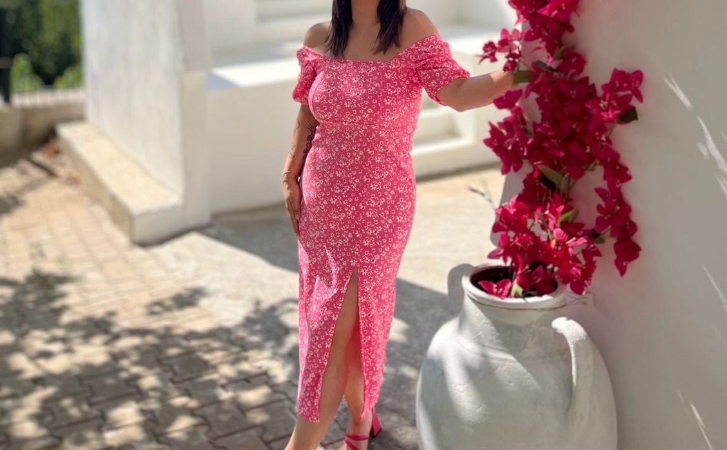 Pembe, düşük omuz kullanılabilir ve yırtmaçlı sırt dekolteli midi boy elbise. 1.58 64 kilo kısa topuklu ile duruşu görseldeki gibidir. Yırtmaç detayı çok derin değil sırt dekoltesi de ayarlanabilir ipli. Bir kez giyildi hiçbir defosu yok.