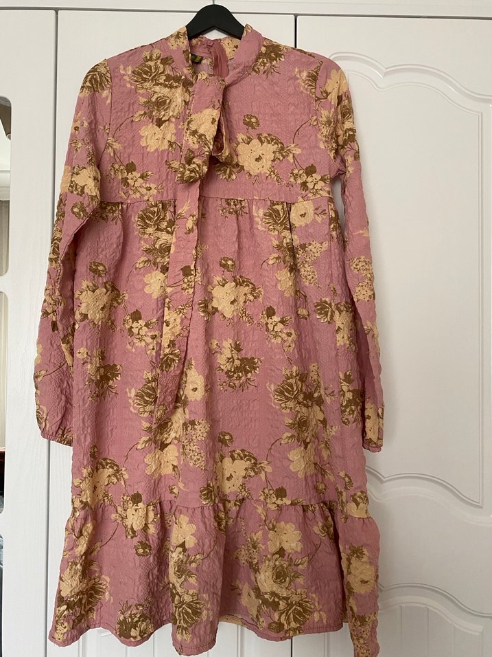 Pembe keten kumaştan uzun elbise, çiçek desenli ve fırfırlı detaylara sahip. Yüksek yakalı ve uzun kollu, bol kesim vintage bohem tarzda.