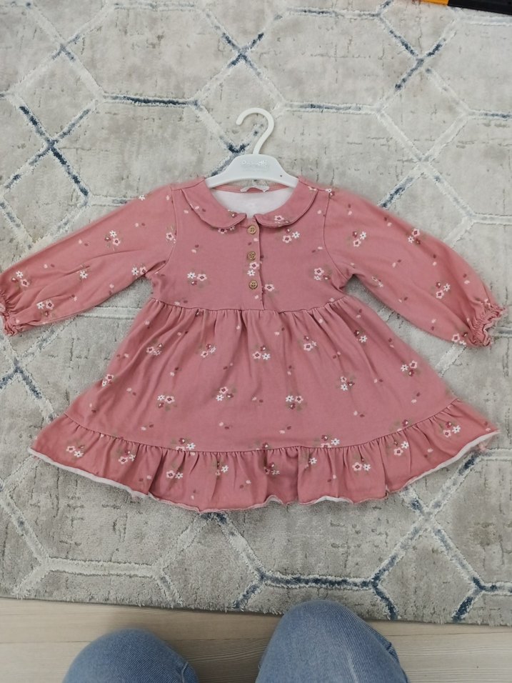 Pembe renkte, uzun kollu, çiçek desenli ve fırfırlı detaylara sahip bol kesim kız elbisesi. Bohem tarzda rahat bir model.