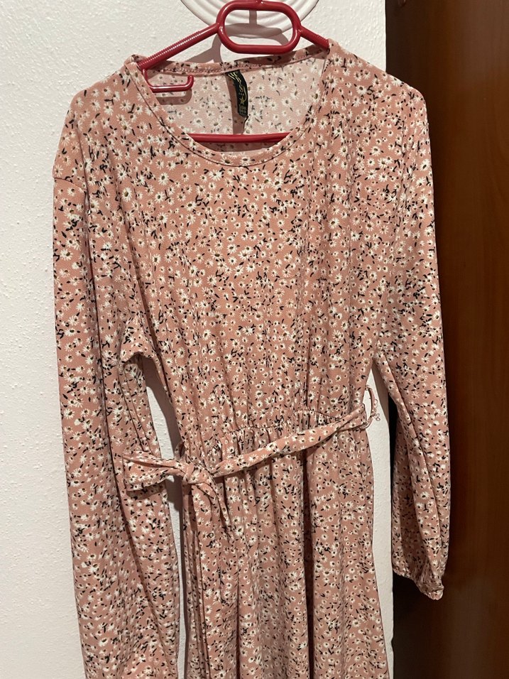 Pembe pastel tonlarda, uzun kollu ve bol kesim kadın elbisesi. Desenli ve kemerli, günlük kullanıma uygun yazlık esneyen kumaştır.