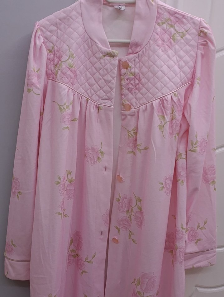 Pembe renkte, uzun kollu ve çiçek desenli, üst kısmı kapitone detaylı, bol kesim kadın sabahligi. Rahat geceler ve sabhlar için uygundur.boy 130 iki kol arası 52 cm son fiyat