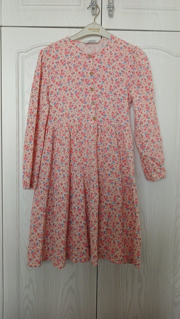 Uzun kollu, yuvarlak yakalı ve düğmeli ön kısmı olan, bol kesim kız elbisesi. Pastel pembe çiçekli baskılı, yumuşak sentetik kumaştan yapılmıştır.
