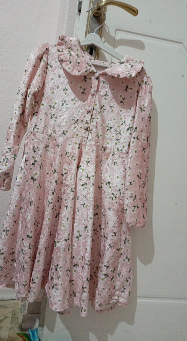 Yumuşak sentetik kumaştan yapılmış, düğmeli önü, V yakası ve uzun kollu, bol kesim pembe çiçekli kız elbisesi. Bohem tarzda, pastel renkte.
