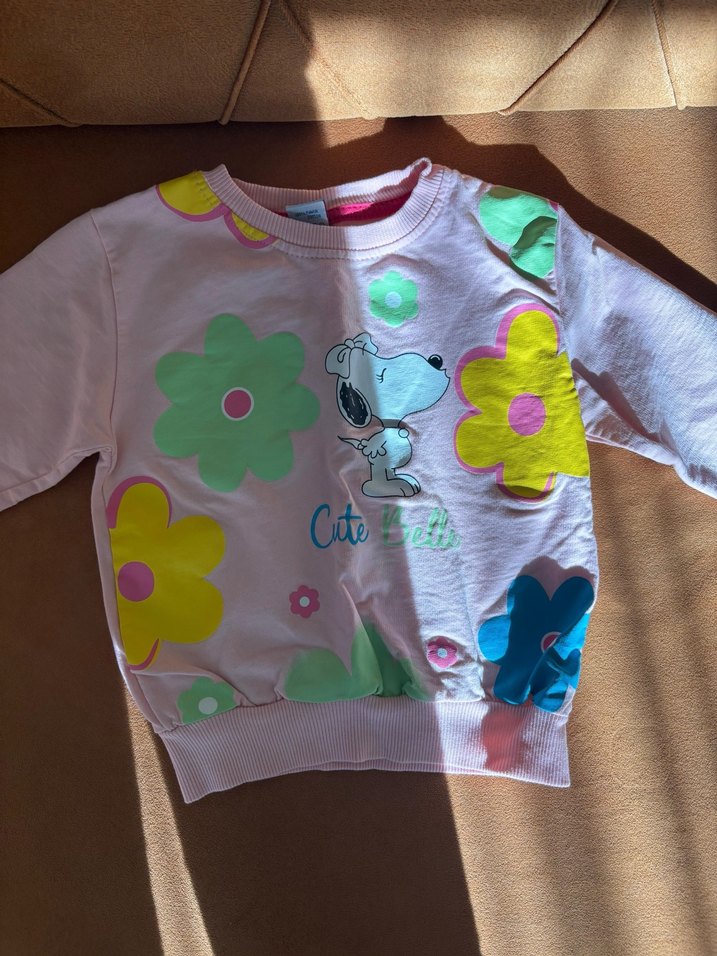 Etiketi 4-5 yaş ancak 3 yaşa uygun. Uzun kollu, bisiklet yaka ve bol kesim kız sweatshirtü. Pastel pembe renkli, renkli çiçek baskılı ve düğmeli detaylı. Yumuşak ve sıcak kumaştan, günlük sokak stiline uygun.