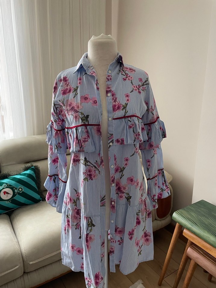 Uzun, bol kesim pamuklu gömlek, yakalı ve fırfırlı detaylara sahiptir. Pastel çiçek desenli, uzun kollu, bohem tarzı için uygundur .