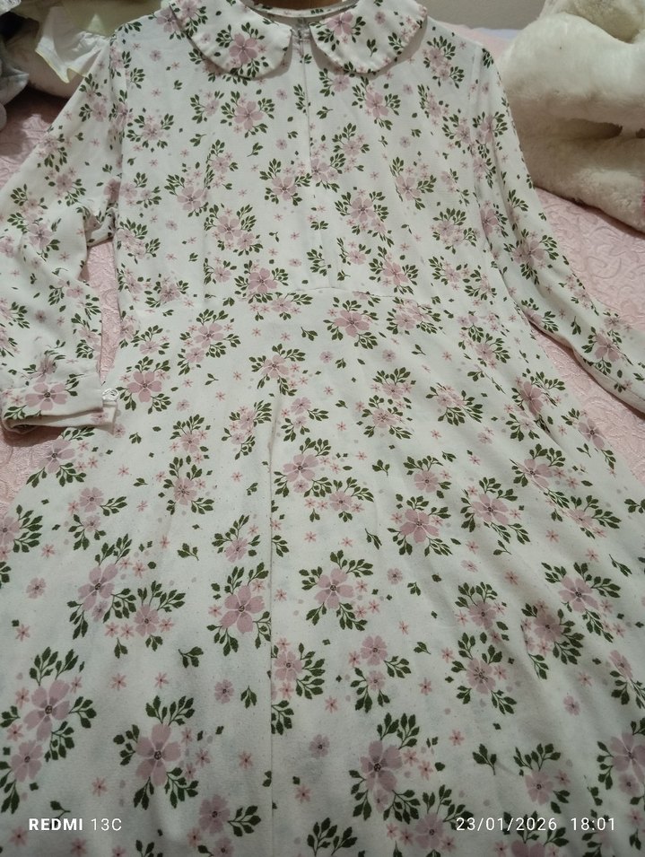 Pastel pembe çiçek desenli, uzun kollu ve V yakalı vintage tarzda, düğmeli ve rahat kesim uzun elbisedir. kullanilmistir tuylenmesi vardir. M/L beden uyumludur.