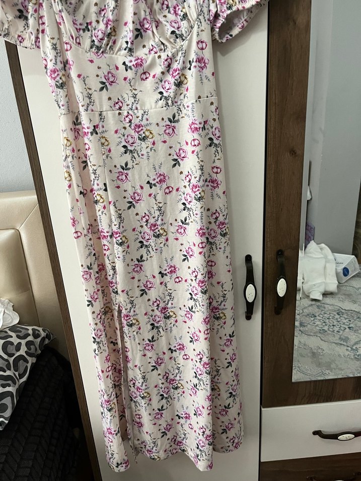 Pembe çiçek desenli, uzun ve vücuda oturan bu elbise, straplez yaka ve ince askılara sahiptir. Yumuşak sentetik kumaştan, bohem tarzda drapeli bir tasarıma sahiptir.
