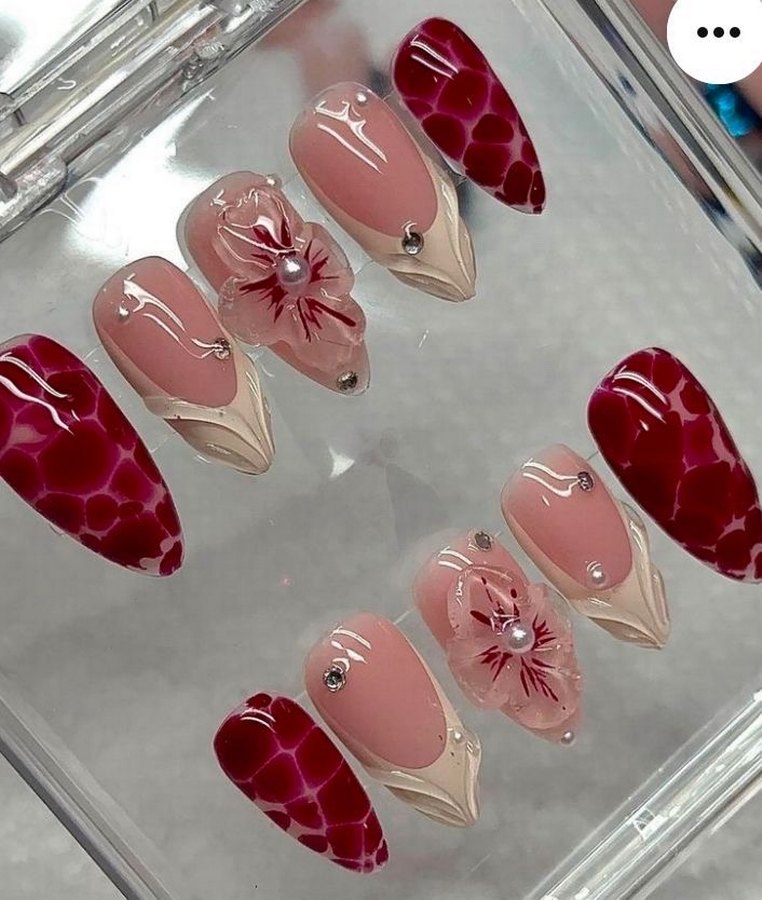 Açık pembe tonlarında, çiçek desenli ve küçük taş detaylı tırnak süsleri, parlak ve desenli yüzeylerle birleşiyor.