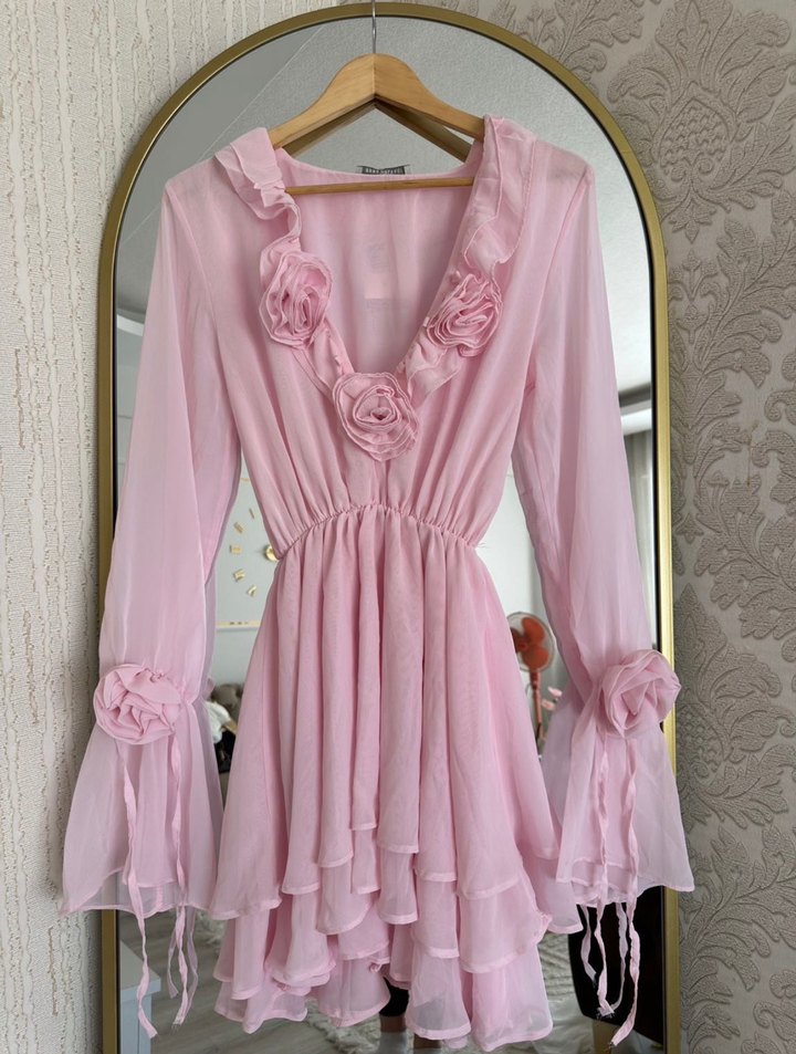 Pembe uzun kollu ve V yaka, çiçek şeklinde volan detaylı mini elbise