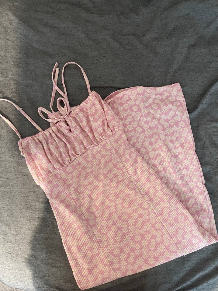 pembe çiçekli yırtmaçlı elbise