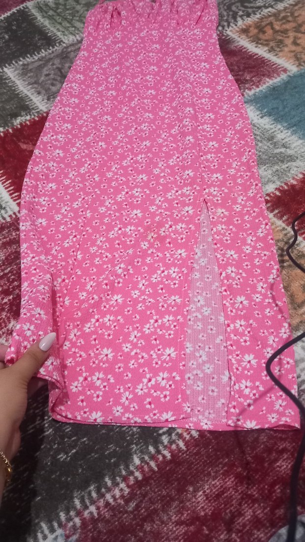 Sentetik kumaştan yapılmış, pastel pembe çiçek desenli, fermuarlı ve vücuda oturan bohem tarzda elbise xs /s uyumlu sadece 1 kez kullanıldı