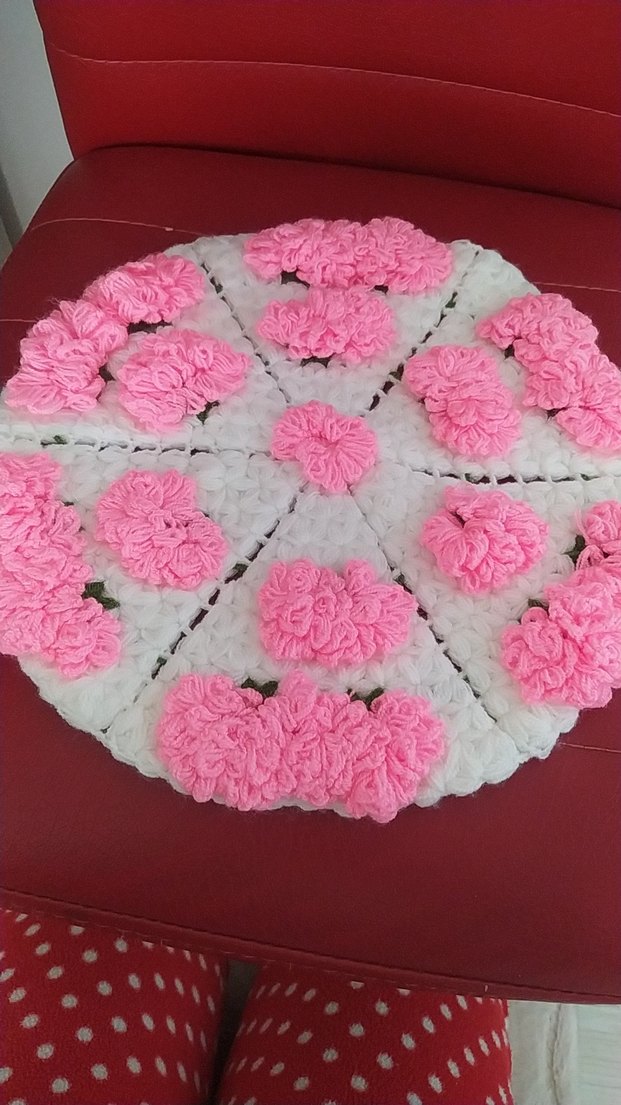 Beyaz zemin üzerine pembe çiçek desenleriyle yuvarlak, dokulu ve renkli masa örtüsü.