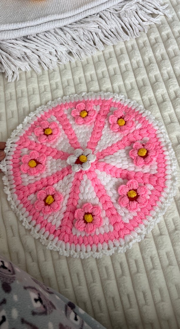 Pembe ve beyaz desenler ile çiçek detaylı yuvarlak örgü nihale, yüzey koruması için ideal.