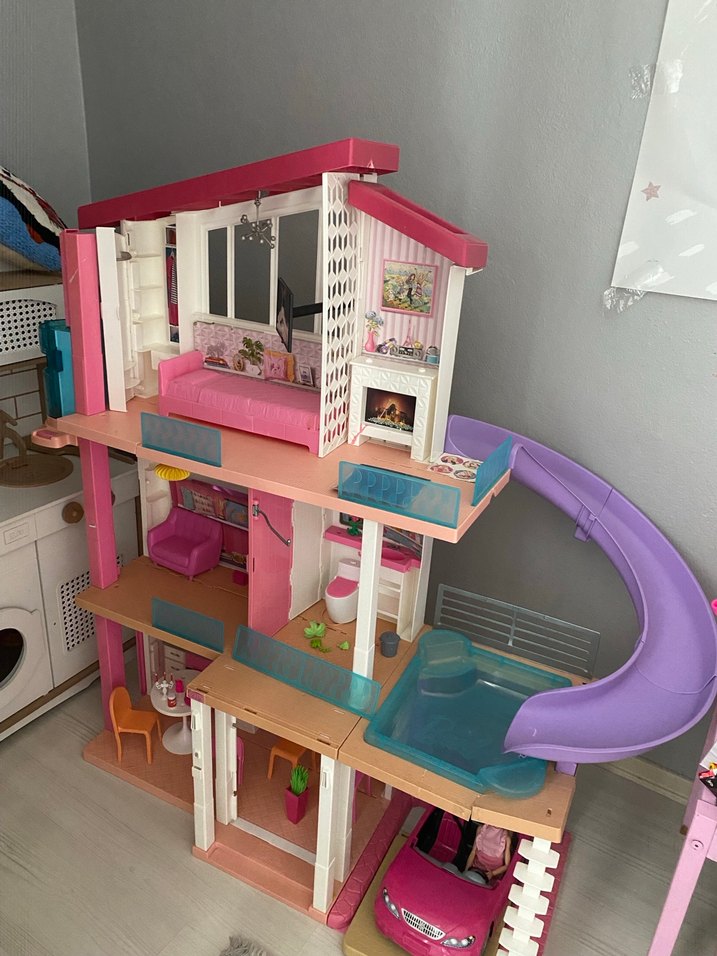 Pembe tonlarında, çift katlı detaylı oyuncak ev. İçinde oturma odası, şömine ve yemek alanı bulunur.