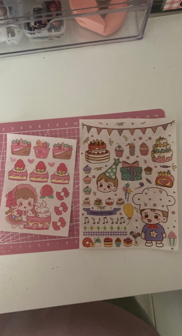 Pembe pastel renklerde, pasta ve karakter temalı renkli çıkartmalar içeren planlayıcı seti.