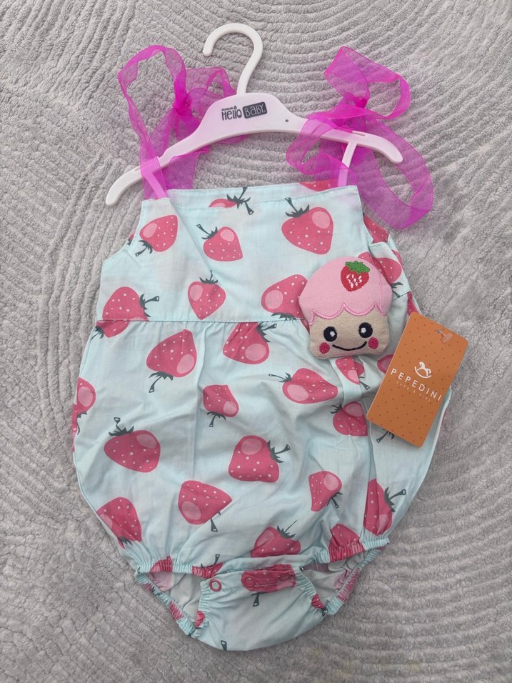 Pembe çilek baskılı tulum, pastel tonlarda, fırfırlı askılar ve lastikli bacak kısmı ile rahatlık sağlar.