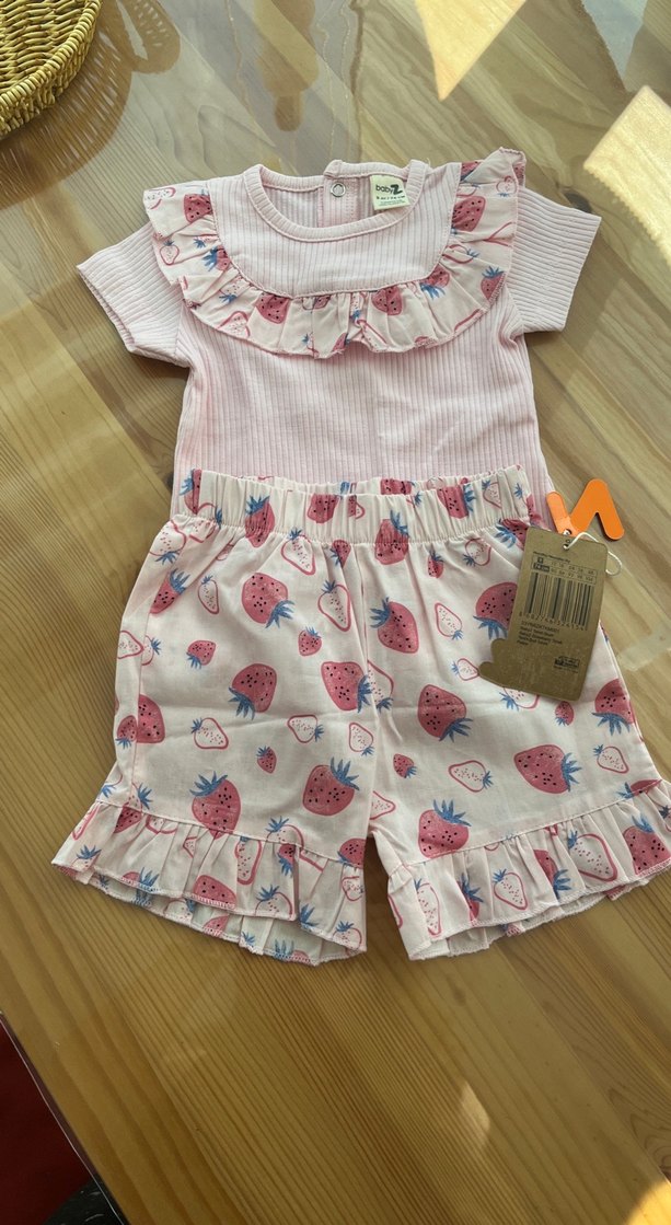 Pembe pastel tonlarda, kısa kollu ve fırfırlı detaylı kız bebek takımı. Üst ve şort çilek desenli, yumuşak kumaştan yapılmıştır.