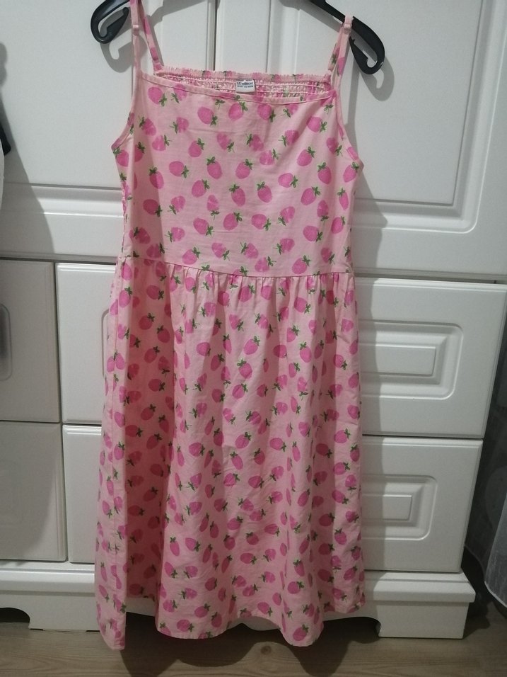 Pembe renkte, askılı kız elbisesi. Pamuk dokulu, rahat kesim ve pastel çilek desenli, bohem tarzda.