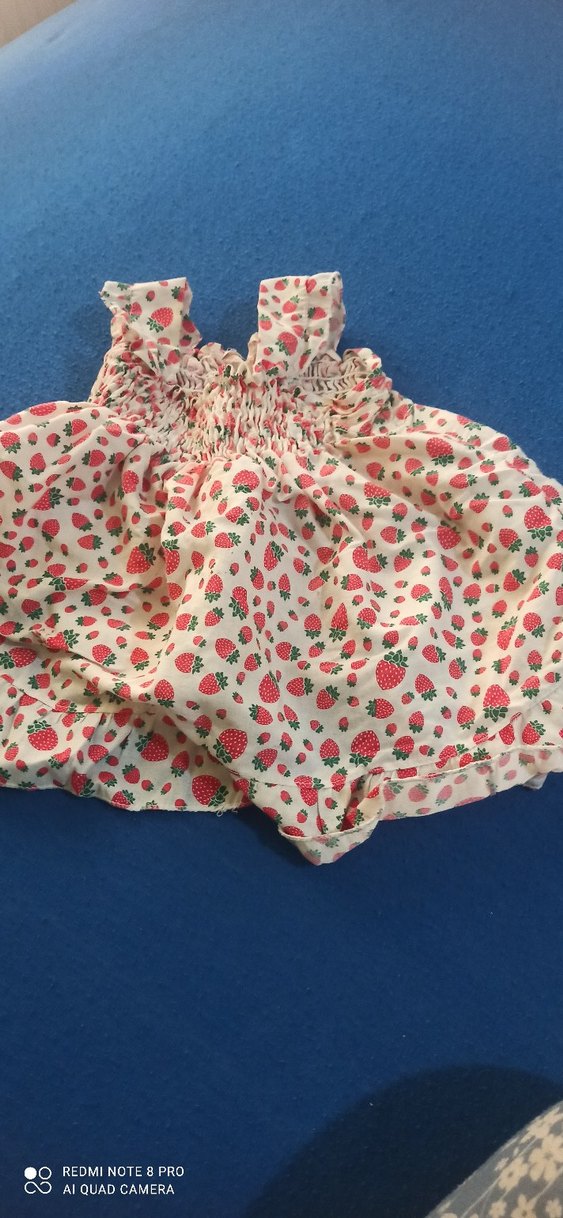 Çilek desenli, kolsuz, straplez ve bol kesim kız elbisesi. Yumuşak dokulu kumaştan, bohem tarzda, fırfırlı detaylı.