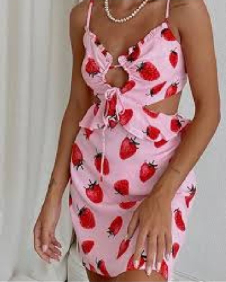 V yaka, fırfırlı ve askılı kısa pembe elbise, yumuşak sentetik kumaştan, çilek baskılı. marka temsilidir
