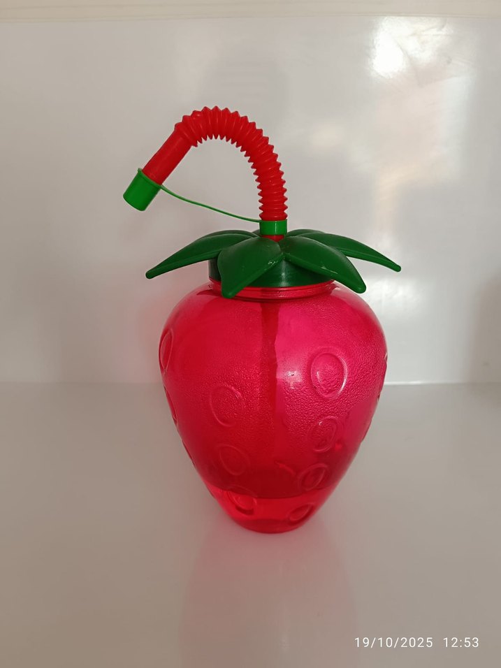 Canlı pembe renkte, esnek yeşil pipeti olan çilek şeklinde su oyuncağı. Eğlenceli su aktiviteleri için uygundur.