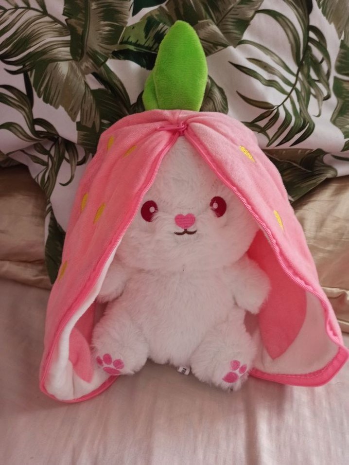 Yumuşak beyaz peluş oyuncak, üstünde yeşil yapraklı pastel pembe çilek şeklinde kapüşonla kaplanmış. Sevimli yüz detayları ve pati izleri bulunur.
